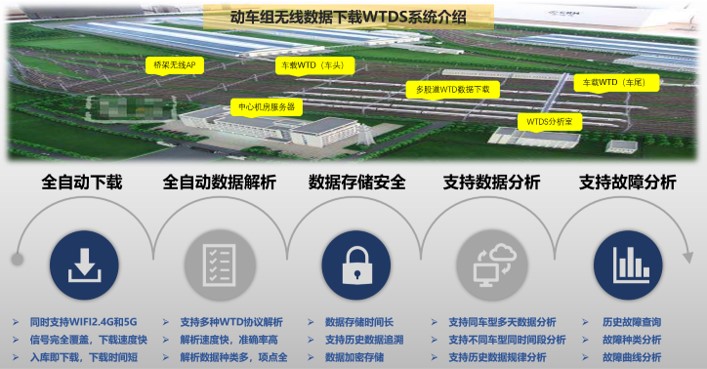 动车组WLAN无线数据下载系统(简称WTDS)。系统在动车组入段后对车载运行数据、故障数据、累计数据等信息自动下载,自动监测动车组车载信息,采用标准的解析规则对数据详细分析,对动车组故障信息自动报警,实现数据检修。通过WLAN设备自动传输功能,对动车组数据自动下载,实现动车组数据实时落地。