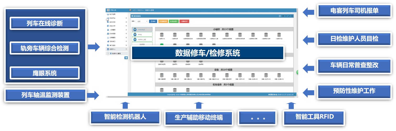 采用信息系统集成的方式;将信息化、自动化、数字化等技术应用到轨道交通车辆日常维修维护过程。 实现对车辆日常维修维护数据的标准化、流程化管理。通过实时的信息交互与信息共享,支持各维修维护环节高效率协同和顺畅衔接;规范作业流程,提高作业效率及作业人员综合素质,降低运维成本。 同时引入轨旁检测设备、智能巡检机器人等智能化装备及辅助终端设备,减少人工干预并有效的提高作业质量。