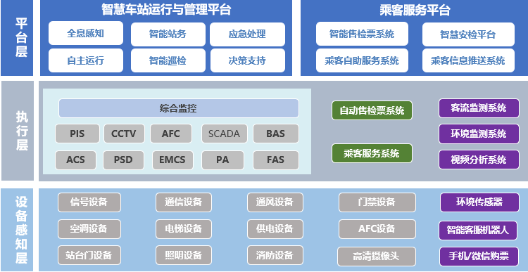 通过感知层、执行层及应用层既有业务和新功能的融合,在综合监控系统基础上,集成视频智能分析、客流预测分析等系统,打造智慧车站运行与管理平台,实现车站运行状态全方位信息呈现、自动化运行、应急处理等功能。
